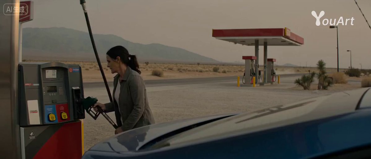 Create a high-quality cinematic scene of a woman at a desert gas station discovering a stash of cash and a weapon before fleeing.