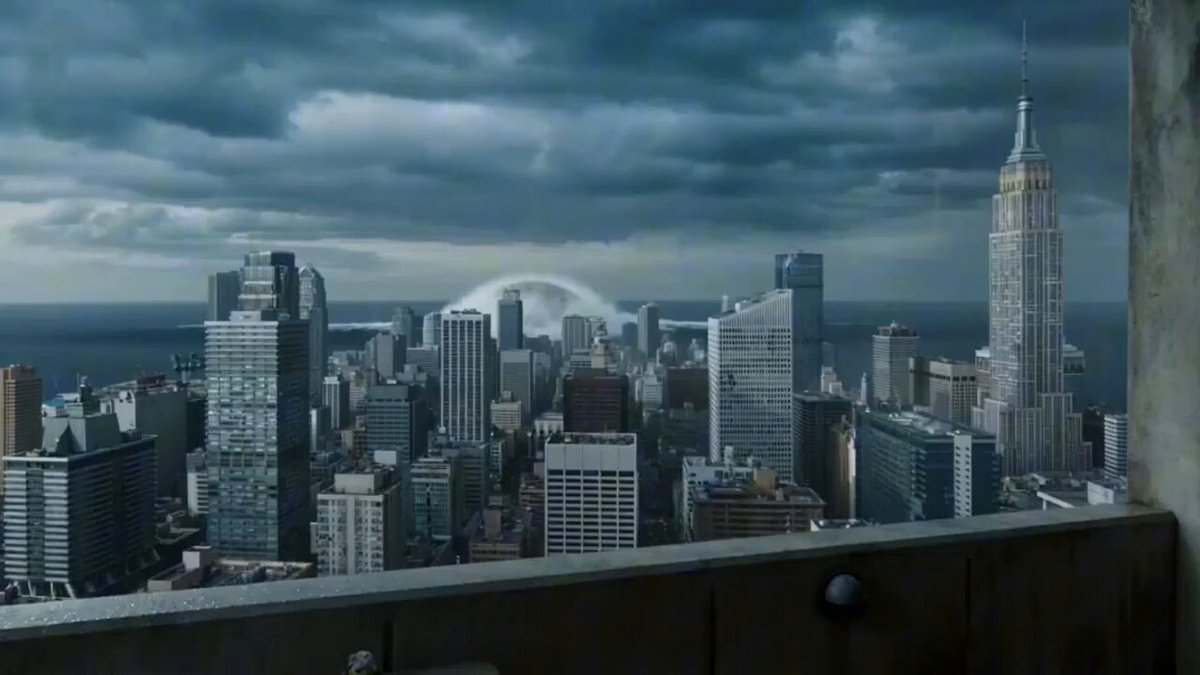 Witness a massive, multi-colored ball spinning intensely as it surfaces from dark ocean waters toward a distant urban skyline, captured from a high balcony perspective.