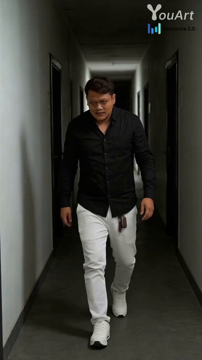 A focused prompt for creating a cinematic fight sequence where a heavy-set Indonesian protagonist overcomes several machete-wielding foes in a hotel corridor.