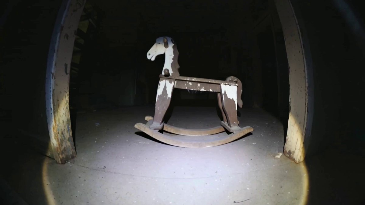 POV Horror Film Scene with Creepy Rocking Horses