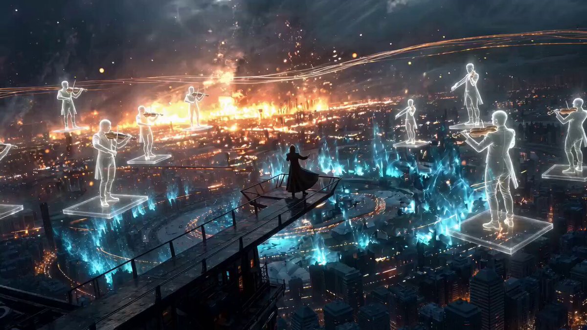 An incredibly creative and cinematic scenario featuring a solitary conductor who summons spectral musicians to illuminate a dark cityscape through shimmering golden melodies.