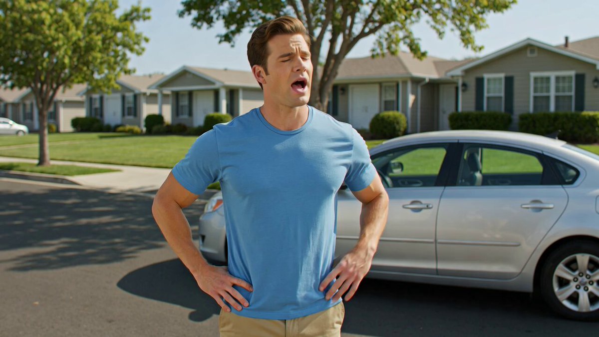 A sophisticated behavioral prompt depicting a man weighing his options before heading to a car wash located 50 meters away.