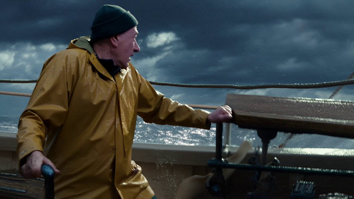 A man is on a seaboat during a massive rain storm as a large sea monster emerges from the water and bites the boat with its' teeth and drags it into the ocean